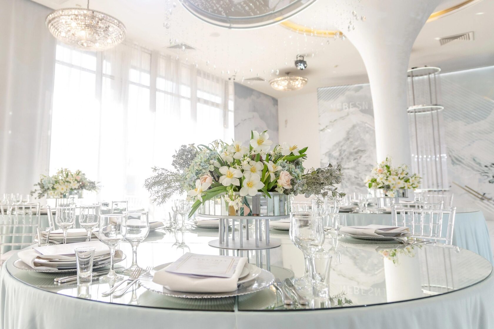 В светлом банкетном зале будут гармонично смотреться наряды в спокойных пастельных оттенках.